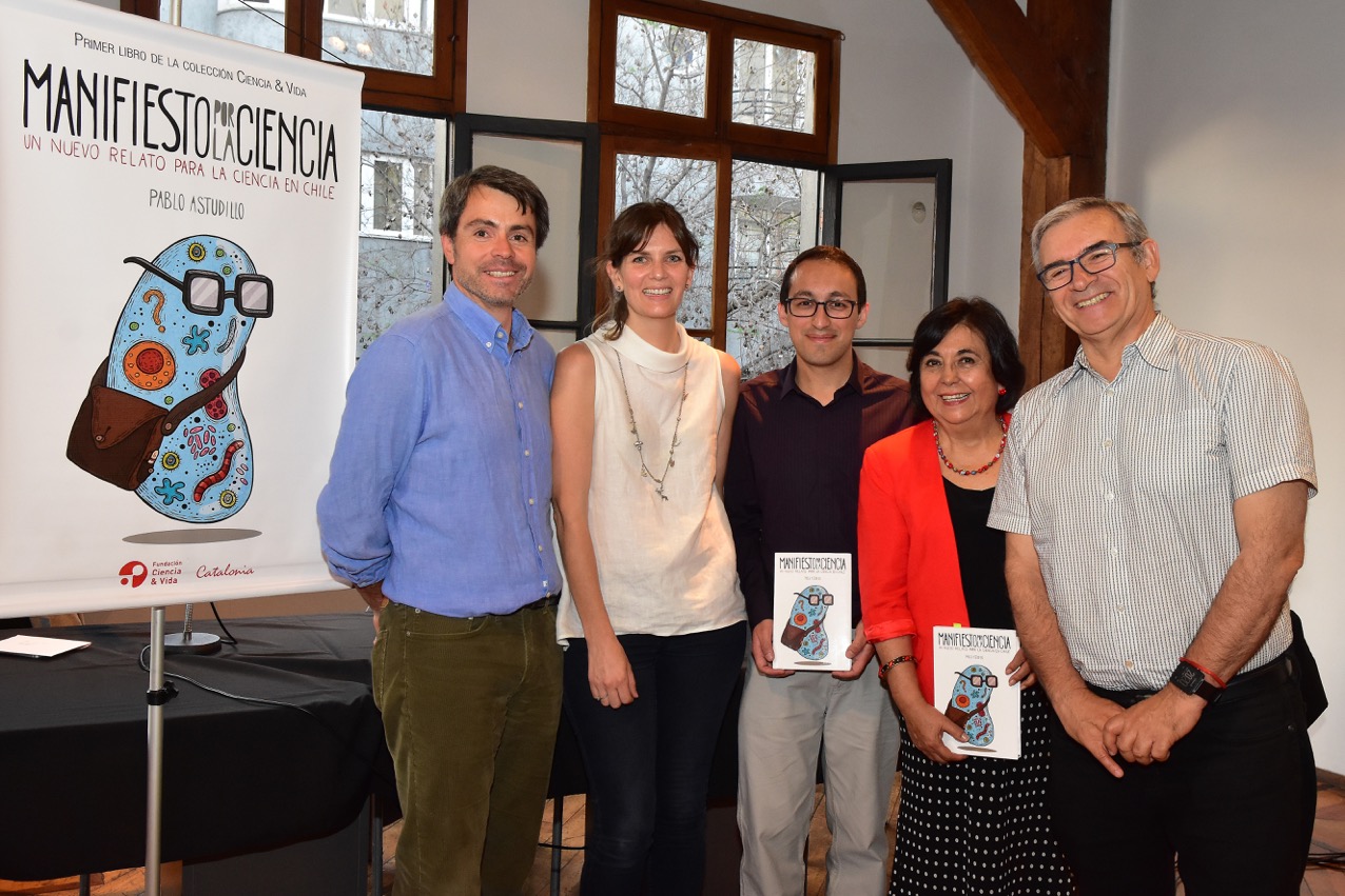 During the launching ceremony of the book “Manifiesto por la Ciencia, un nuevo relato para la ciencia en Chile”. From left to right: Cristóbal Undurraga (ASECH), Carolina Torrealba (Fundación Ciencia & Vida), Pablo Astudillo (author of the book, Fundación “Más Ciencia”), Cecilia Hidalgo (Universidad de Chile, National Science Award) and Arturo Infante (Editorial Catalonia).