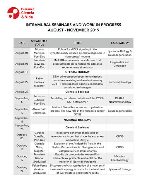 19/07/2019Students at Fundación Ciencia & Vida are requested to give a 20-25 min presentation to show and discuss their research project progress with FCV’s researchers, postdocs and fellow students.