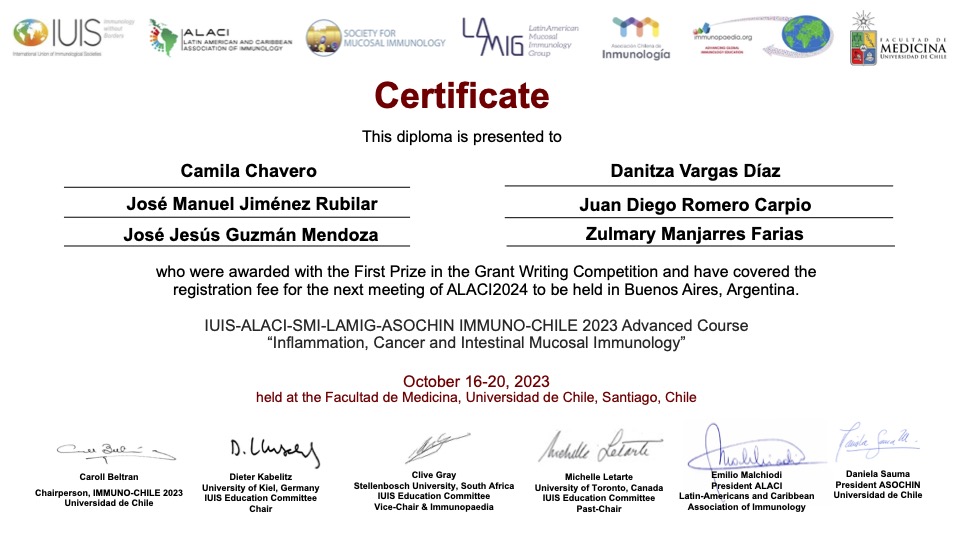 Por su parte, el trabajo desarrollado bajo el liderazgo de Zulmary Manjarres (estudiante de doctorado del Laboratorio de Neuroinmunología, Fundación Ciencia & Vida), titulado “Development and characterization of a vaccine against Crohn-like disease in a murine model”, fue galardonado con el premio al mejor proyecto de ICIMI 2023.