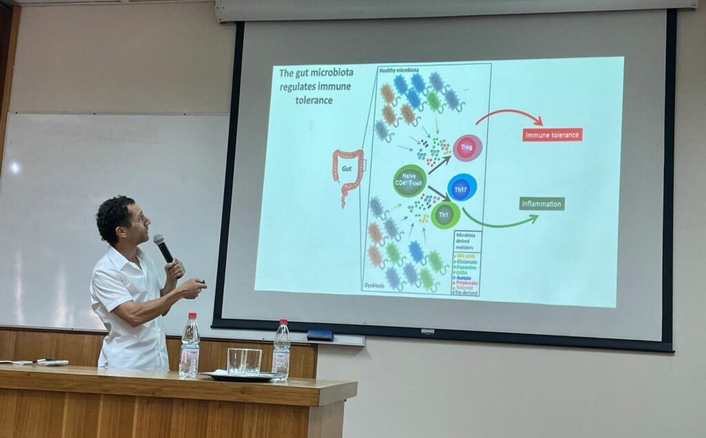 En mi charla abordé primero los mecanismos generales por los cuales las bacterias de la microbiota intestinal son capaces de comunicarse con el sistema nervioso central, regulando así su funcionamiento. Posteriormente, la charla se centró en los mecanismos por los cuales la microbiota intestinal, a través de la regulación de la respuesta inmune de la mucosa intestinal, puede influir en el desarrollo de la enfermedad de Parkinson”, explicó el Dr. Pacheco.