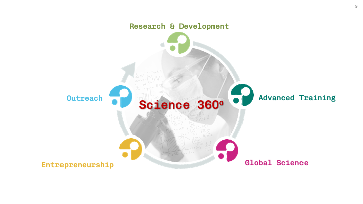We firmly believe that science plays a central role in our social and economic development: it is our gateway to a knowledge-based economy and towards a more equitable society. The scientific excellence of the intramural R&D groups provides credibility to our Center in the global world of high biological technology, both in the academic and bioentrepreneurial fields, allowing productive and open interactions at all levels. In order to position science as one of the key drivers of our society, since our creation, we have adopted a strategy that we call Science 360°: an interdisciplinary approach that allows us to simultaneously address science (R&D groups), as well as education and scientific culture (Advanced Training and Outreach groups) and the business of science (Intellectual Property, Technology Transfer, Business and Bio-entrepreneurship groups). In essence, our efforts are based on five pillars: