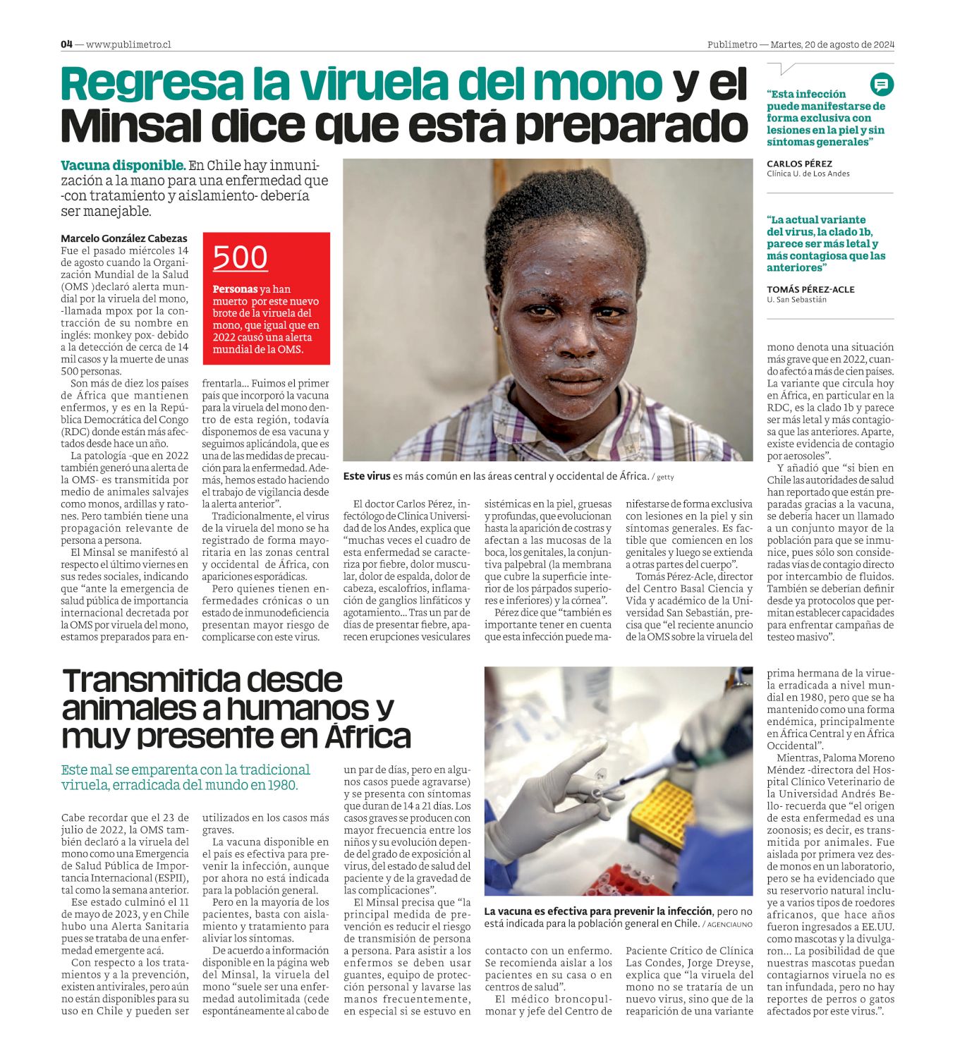 Dr. Tomás Pérez-Acle: “La variante que circula hoy en África, en particular en la RDC, es la clado 1b y parece ser más letal y más contagiosa que las anteriores. Aparte, existe evidencia de contagio por aerosoles”.